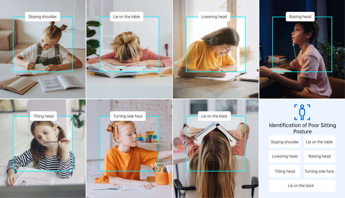 Real-time detection of abnormal postures such as slanted shoulders, lying on the desk, head down, head up, tilted head, side face, and lying back, with duration tracking.