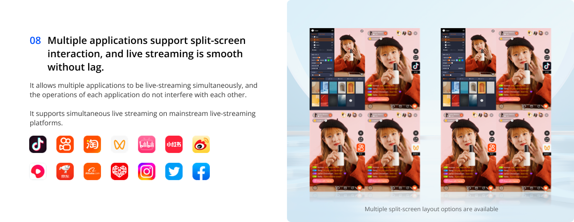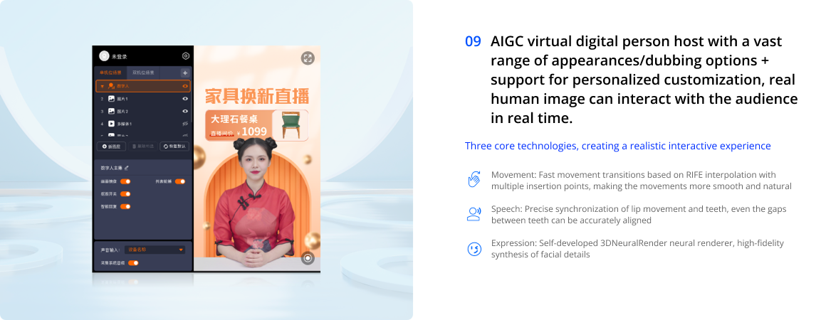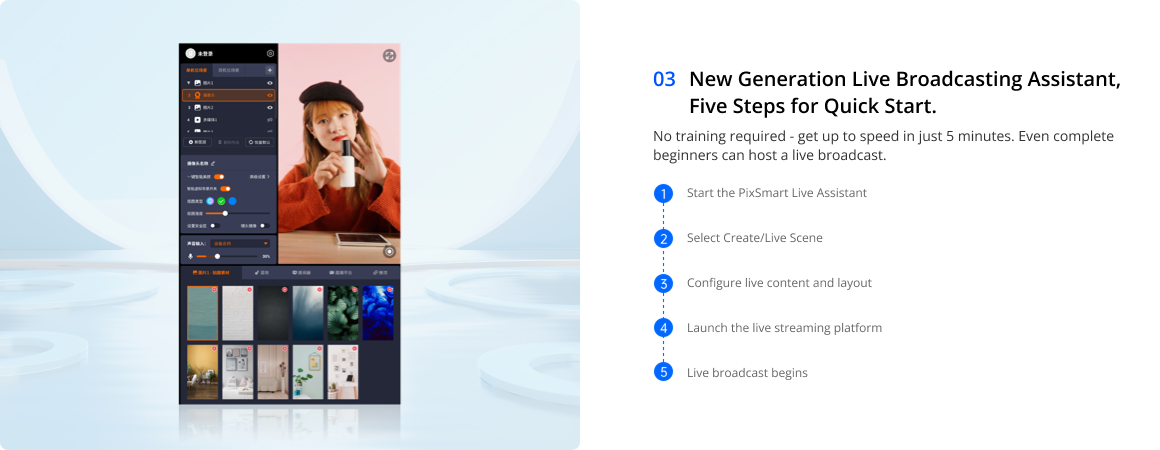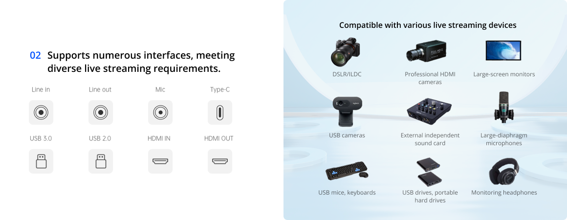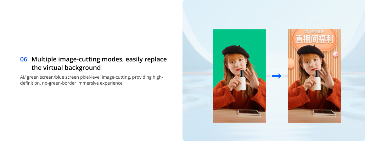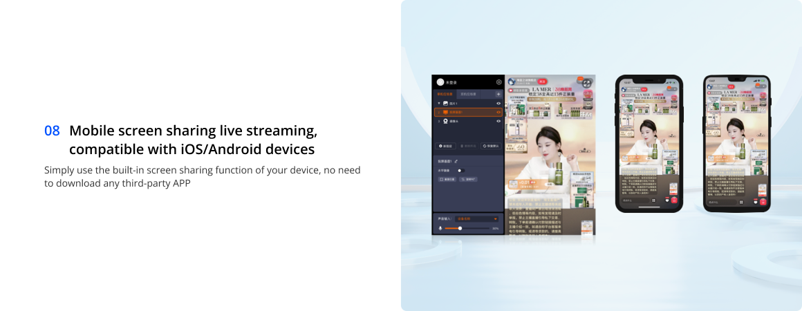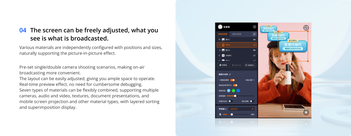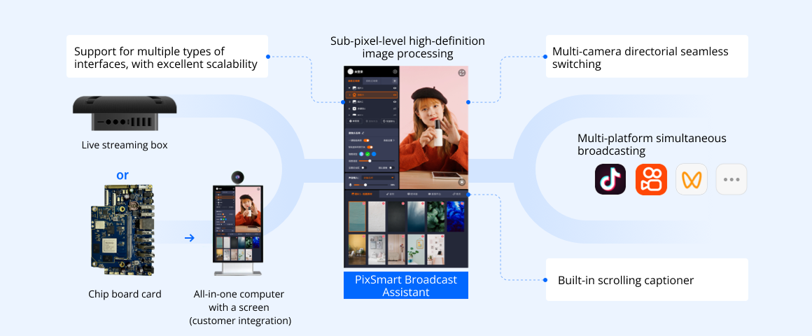 An integrated software and hardware solution to meet the needs of various live streaming scenarios, enabling professional live streaming effects at low cost.