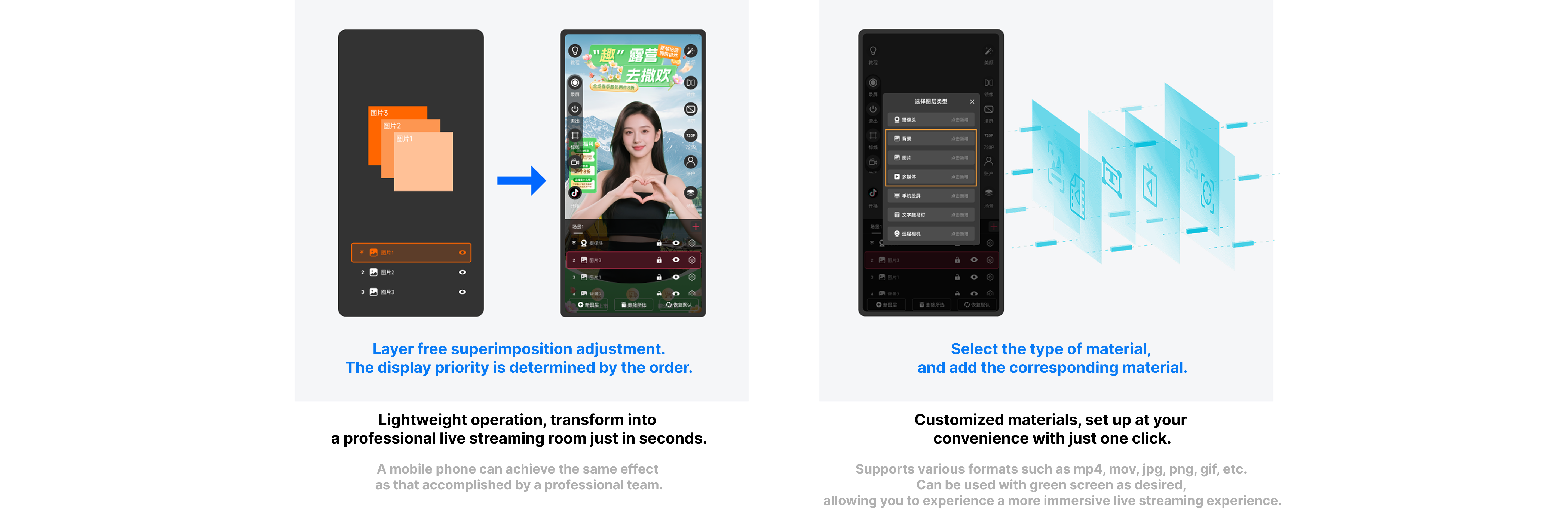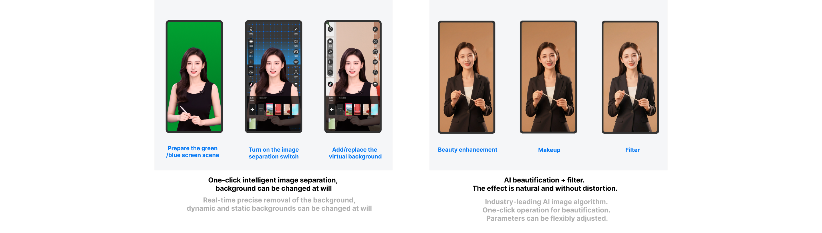 A professional mobile live streaming tool, offering powerful beauty filters, chroma keying, virtual backgrounds, custom assets, and more. Build a professional virtual studio with just your phone.